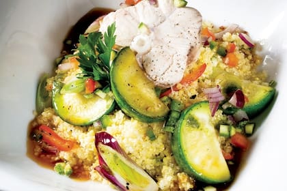 - En una paellera o sartén grande de bordes altos agregar unas gotas de aceite de oliva, saltear el ajo en láminas, la cebolla, el morrón y el apio en cubitos. Agregar el puerro y la cebolla de verdeo en rodajas y cocinar 5 minutos. Incorporar el mijo y revolver con una cuchara de madera. Salpimentar y desglasar con vino blanco. Dejar evaporar el alcohol y cubrir con caldo de pescado (dos centímetros sobre el mijo). Cocinar a fuego bajo durante 20 minutos. Agregar el pescado cortado en trozos parejos y sumergir dentro de la preparación agregando nuevamente caldo. Cocinar hasta que el pescado esté cocido, al igual que el mijo. Agregar los zapallitos cortados en octavos, previamente cocidos al vapor, y espolvorear con perejil fresco picado.