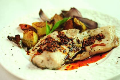 Este plato es de mi cosecha pura, pura. Lo hice el domingo pasado rapidísimo, porque es muy simple, pero el resultado fue soberbio. Salió un plato delicado, sutil y con un sabor increíble. Lo hice con corvina negra que haía conseguido a buen precio en mi pescadería, pero pueden hacerlo con algún otro pescado que tenga consistencia y firmeza (pez ángel? gatuzo? cazón?)