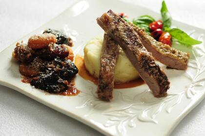 Esta receta está inspirada en varias que anduve mirando por ahí, y de verdad salió maravillosa. Tanto el puré al curry como la compota pueden servir de maravillas para acompañar un pollo especiado o un pescado a la plancha, aunque a mí me gusta especialmente para acompañar cualquier tipo de carne de cerdo al horno. Yo elegí el matambrito porque era lo que tenía a mano.