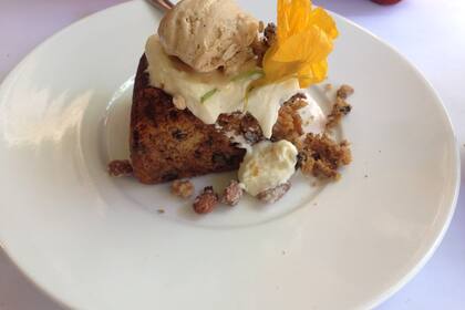 Servir la carrot cake con una cucharada de esta crema, encima una bocha de helado de canela y una flor comestible para decorar.