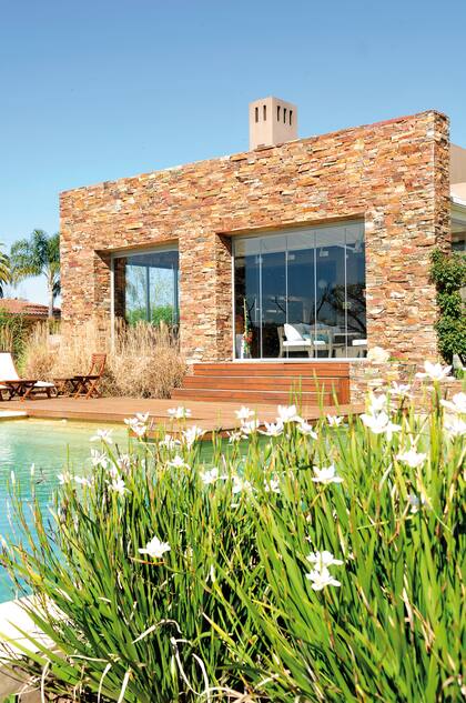 Esta pileta se “encajó” en la ele que forma la arquitectura: entre el volumen del sector social de la casa y el volumen del ala de dormitorios.