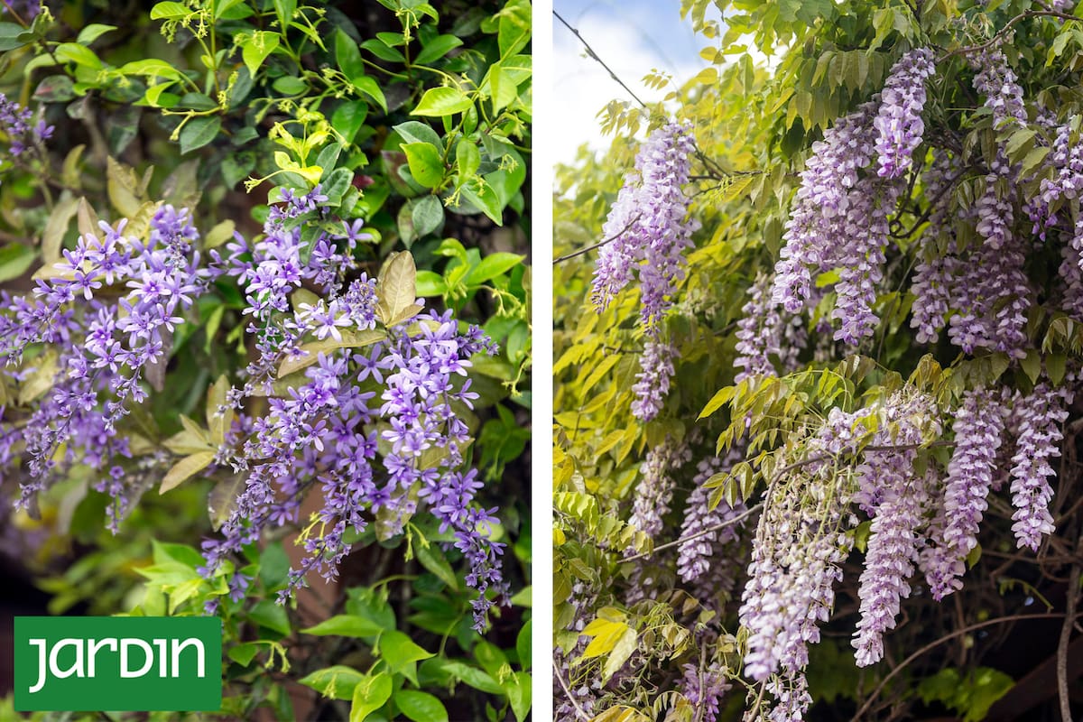 Son parientes lejanas en el imaginario ornamental, no en la botánica. La glicina lleva siglos de fama.