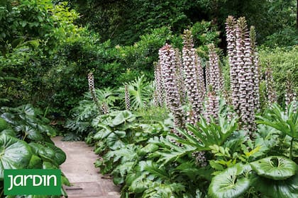 Los helechos aportan volumen y frescura, mientras que los acantos (Acanthus mollis), las aves del paraíso (Strelitzia nicolai) y los bananeros (Musa x paradisiaca) aportan volumen y estructura.