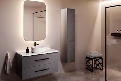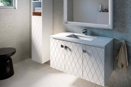 Cada colección se presenta en cinco medidas de mobiliario suspendido con puertas o cajones, mesadas, bachas y herrajes que combinan con cabinets de almacenaje y espejos con LED incorporado, un gran recurso para sumar un toque de luz y ayudar a que los espacios se sientan más amplios.
