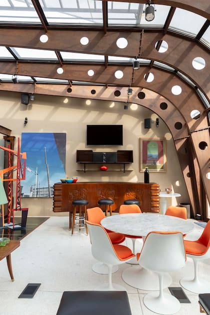 “Por la disposición municipal de no alterar la fachada histórica, este nuevo piso sobre la terraza se hizo retirado, es decir que no se detecta caminando por la calle Defensa. Pero, desde adentro, su estructura imponente impacta más aún en contraste con las antiguas edificacione del barrio. Sobre estas vigas de hierro, que se calaron con círculos decrecientes, se ubicó el techo de vidrio, que se puede proteger con toldos cuando el sol pega fuerte”, nos explicó su hija, la arquitecta Sofía Calvaresi, a cargo de la reforma junto con Piera Aglietta.