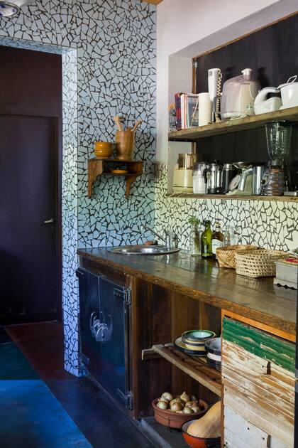 En la cocina conviven la madera y el acero inoxidable con el piso de cemento alisado con dibujos y las paredes revestidas con la técnica del azulejismo, estas últimas, obras de Pablo. La cortina que inunda el espacio con un arco iris de colores es otro quilt de Carmela.