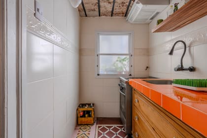 Como suele suceder en este tipo de construcciones, los metros dedicados a la cocina eran muy escasos, así que la intención fue acentuar la luz y funcionalidad con una gran mesada revestida en cerámicos naranjas, y muebles más amplios.
