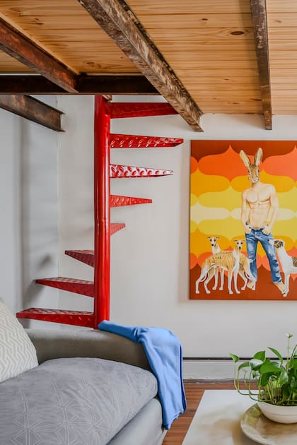 El espacio superior conserva un aire más calmo y despojado, con un piso de tablas blanqueadas que invita al descanso. La atención se la lleva el techo original de la casa, que Rubén eligió dejar descubiertos.
