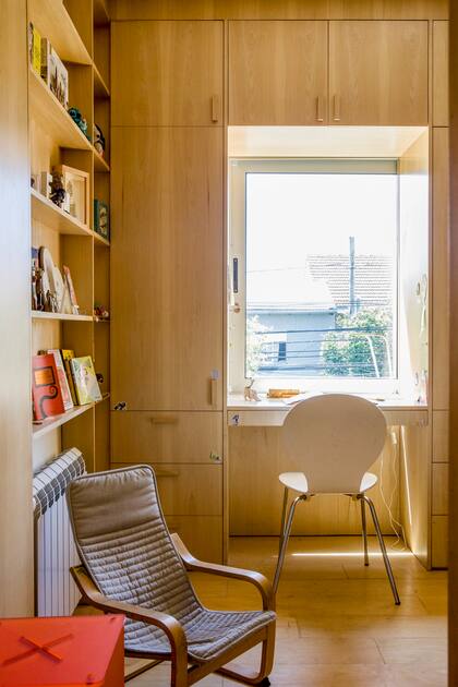“Optamos por una madera clara, sin muchas vetas, para mantener los planos limpios y no recargar. El piso, por su parte, es en multilaminado de guatambú de 9mm, cortado a medida a partir de placas de 1,22x2,4m y pegado sobre un fenólico de 15mm. El proceso incluyó redondear los cantos para que los encuentros fueran más suaves y evidenciar los encuentros. El costo de un piso de madera nos resultaba imposible, así que encontramos la forma de lograrlo de manera accesible”, dice Matías.