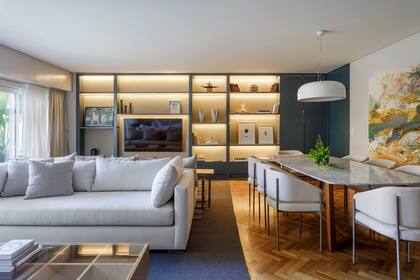 “Comenzamos por modificar la caja: para las paredes, elegimos un tono gris, y usamos un azul profundo como hilo conductor en todo el área social”, explican. La consola fue uno de los muebles que tardaron en definir. Incluso evaluaron sumar una nueva biblioteca, pero finalmente encontraron la dimensión y el estilo justos, con mucha presencia.