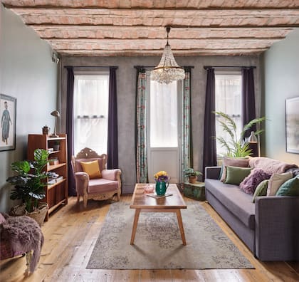 En el living, conviven almohadones de piel o terciopelo y sillones de diferentes épocas. Las ventanas que dan al frente se enmarcaron con gruesas cortinas doble faz confeccionadas en pana y géneros estampados.