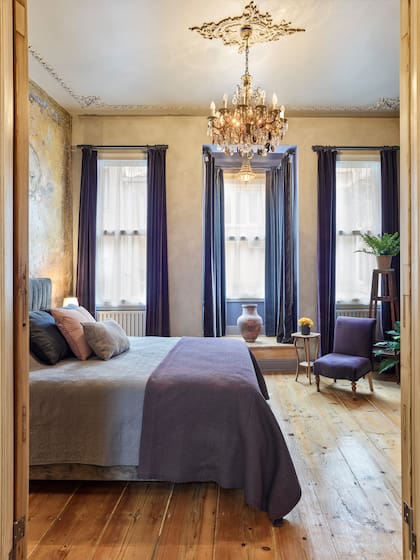 Atravesando una puerta doble en madera al natural, el dormitorio principal deslumbra con sus tres ventanales y su mezcla de tendencias. La cama de diseño contemporáneo contrasta con la araña de caireles y los muebles antiguos comprados en anticuarios de la zona.