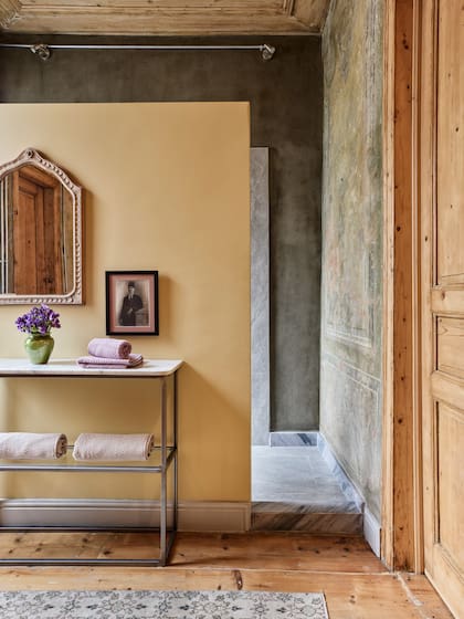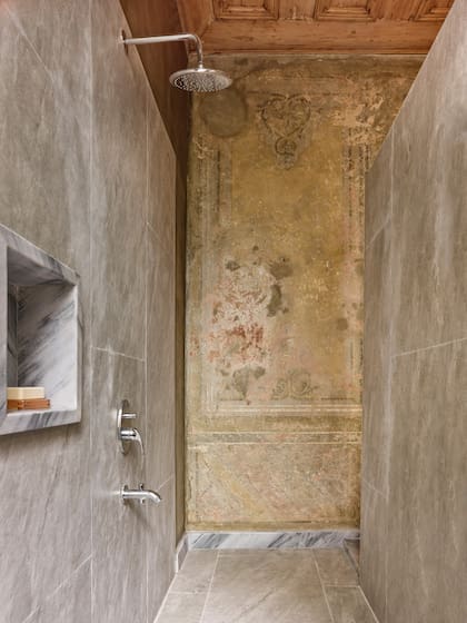 Subiendo otra escalera, un impresionante sector de ducha se ganó al hall distribuidor. Un tabique divide el piso de madera original, dando privacidad a un cubículo revestido en mármol para bañarse apreciando los frescos centenarios que asoman en la pared.
