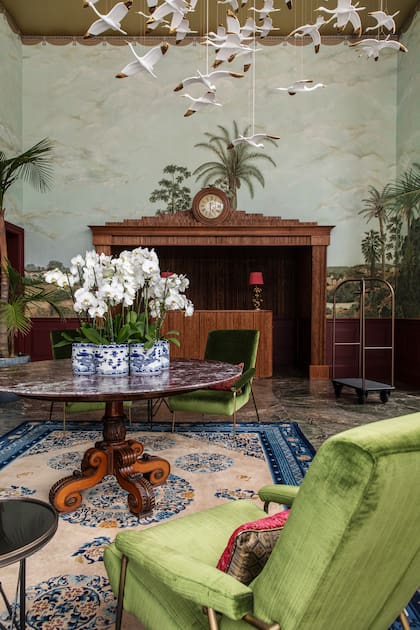 En los espacios comunes reinan los azules y verdes, con detalles en bordó claro. El terciopelo y las porcelanas. El arte siempre presente como voz fundamental de esta historia que se quiere contar. En el lobby se encuentra la primera obra que la artista alemana Eva Mez presenta en Uruguay. Su vuelo sucede frente a un empapelado de 7 metros de largo que reproduce los antiguos cuadros de Frans Post (1612-1680), pintor barroco neerlandés conocido por ser el primer europeo en pintar los paisajes de América del Sur, en especial la zona de Pernambuco en Brasil.