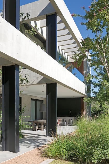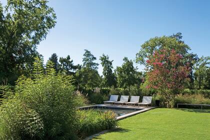 Los jardines fueron diseñados por el estudio de la paisajista Valeria Hermida aprovechando la ubicación privilegiada del lote frente al campo de golf. “Lo que hicimos fue extender esa inmensidad a la casa con árboles que acompañen su altura y texturas de pastos silvestres que acentúen sus líneas”, explica.