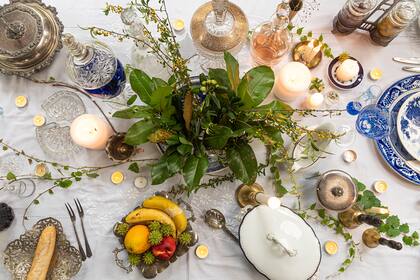 “Las hojas y las ramas de eucalipto siempre funcionan como centro y denominador común. Al tener la hoja alargada permiten hacer un camino sobre la mesa y poner sobre él unas velitas o alguna fruta. Además, cuando se secan también quedan lindas y se pueden volver a usar por varios días. El pino también es una buena elección porque permite jugar tanto con las hojas como con las piñas. En caso de usar ramas, siempre usar floreros que sean altos y finos porque si no bloquean la vista. La incorporación de frutas y verduras desparramadas también suma: depende mucho del color y la textura, pero unos simples limones o naranjas pueden alegrar el conjunto”, comparte.