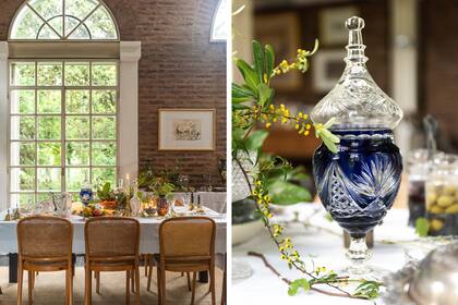 En la primera mesa, Ana buscó armonizar el azul de la vajilla con metales dorados y se le sumó calidez con un centro de hojas verdes que se fue desparramando por la mesa. Si bien no se trataba de un almuerzo propiamente dicho, Ana colocó velas, panes y frutas para tratar de que los objetos volvieran a tener vida una vez más. La intención: que el homenaje que surgió casi por casualidad se sintiera como un banquete, una invitación.