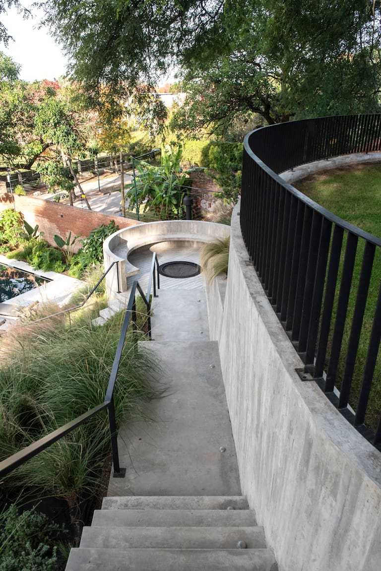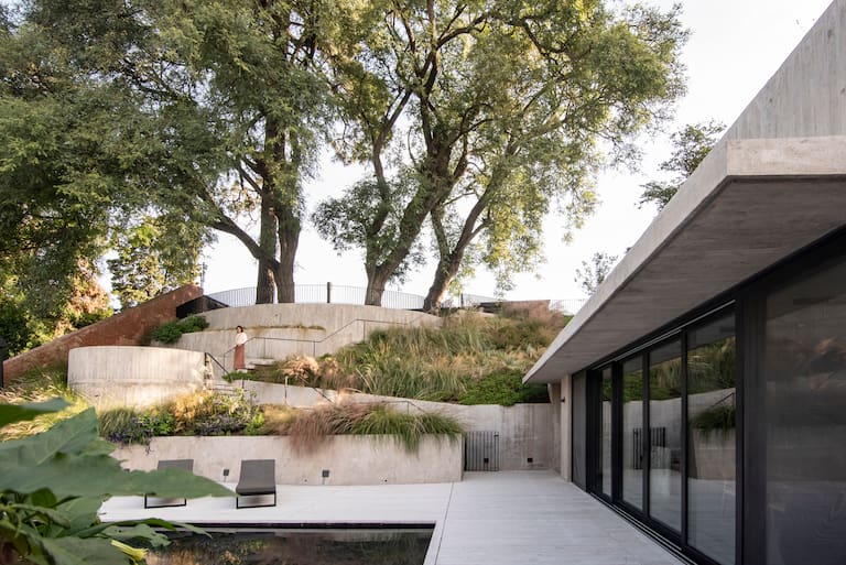 En este terreno en pendiente, el proyecto paisajístico parte de una decisión clave: respetar la barranca y trabajar con ella, no contra ella. La arquitectura se apoya en el paisaje existente y el jardín acompaña esa lógica, consolidando el suelo y reforzando las cualidades naturales del lugar.