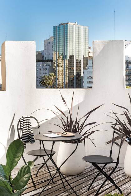 Detalle del deck con mesa y sillas Quilmes que está en la “proa” de la terraza, junto al muro con almenas, otro de los tantos aspectos curiosos del edificio junto con las cúpulas, por supuesto. Acá se sienta el dueño de casa a disfrutar del atardecer y de las primeras luces sobre la 9 de Julio.