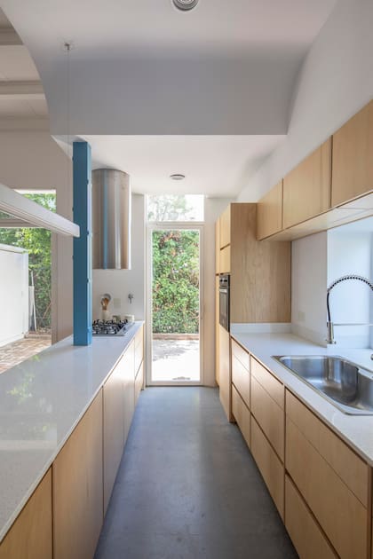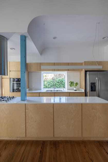 Al demoler las paredes para ampliar la cocina, los arquitectos de estudio Yme se encontraron con la columna que hoy atraviesa mesada.