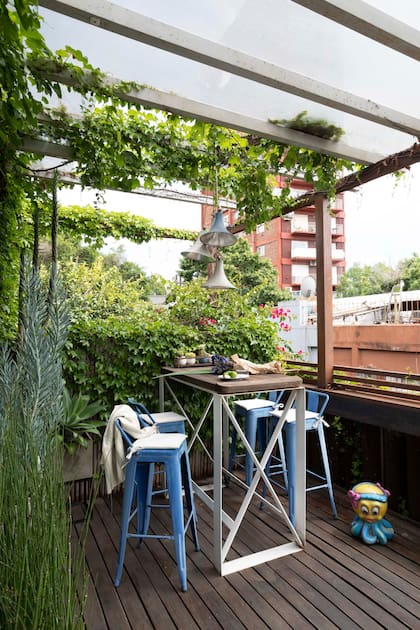 “El patio es un lugar que disfrutamos los tres. A la mañana, tomamos unos mates juntos; cuando cae la noche, encendemos el fogonero. Es muy real la buena energía que transmite el verde”, dice Santiago.