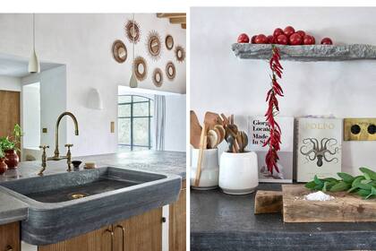 De bordes redondeados, todos los muebles de la cocina fueron hechos en obra y terminados a la cal, incluyendo la campana.
