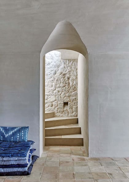Esta casa en Mallorca tiene un exterior tradicional y el verde autóctono de olivos, lavandas, romeros. El interior sigue la melodía, con un fondo de blancos, arenas y grises –pisos de piedra, paredes pintadas a la cal con el toque de pigmentos especiales–, contra el que se lucen las maderas, los géneros que marcan con su color el ánimo de cada ambiente y las formas orgánicas de los vidrios que iluminan.