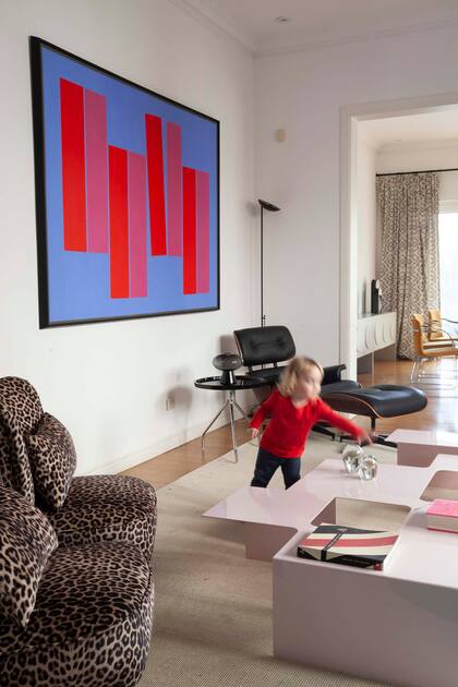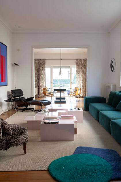Si bien la casa ya había sido reformada cuando se mudaron, era más bien clásica. La apuesta por los empapelados en los sectores infantiles fue capital para darles un nuevo aspecto. El comedor diario convive con el playroom: una mesa Tulip y sillas wishbone conviven con los juguetes de los chicos y televisión.