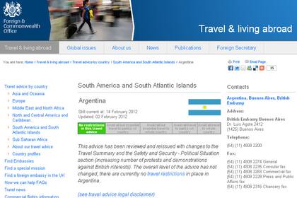Gran Bretaña, país que atraviesa un momento delicado en sus relaciones diplomáticas con la Argentina a raíz del conflicto por las islas Malvinas, empieza advirtiendo a quienes deseen viajar a nuestro país sobre "el aumento del número de protestas y manifestaciones en contra de los intereses británicos", llamando a "evitarlas".