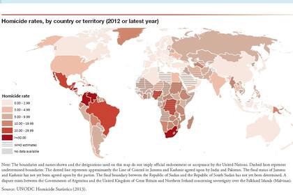 "En la subregión de América del Sur, las tasas de homicidio en el Cono Sur (Argentina, Chile y Uruguay) se acercan a las tasas relativamente bajas que se registran en Europa", especifica el informe.
