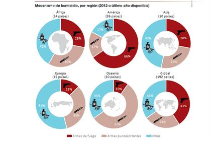 Según el relevamiento realizado por la ONU, las armas de fuego son las que se usan más, dado su elevado nivel de letalidad, y dan cuenta de cuatro de cada 10 homicidios a nivel global.