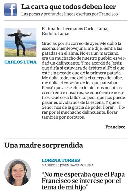 Lorena Torres, madre de David Moreira, el joven linchado en Rosario, relató a la nacion que un vocero de Francisco la llamó el martes pasado a su casa para comentarle que él iba a hacer una referencia al asesinato de su hijo. La mujer no sabía de qué manera Francisco iba a hablar de su hijo, hasta que ayer le comentaron que en algunos portales de Internet se reproducía una carta escrita por el obispo de Roma.