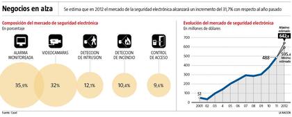 Impulsan ese fuerte incremento los sistemas de alarma y videovigilancia. Según cifras de la Cámara Argentina de Seguridad Electrónica (Casel), ese segmento registra un crecimiento del 31,7% en 2012 con respecto al año pasado.