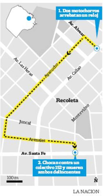 Dos motochorros murieron ayer y cinco personas resultaron heridas, luego de una persecución policial en Recoleta que se había iniciado por el arrebato de un reloj pulsera a un transeúnte y que terminó cuando los delincuentes fueron embestidos por un colectivo de la línea 152 en la esquina de Santa Fe y Montevideo.