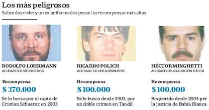 En total, se ofrecen recompensas por las capturas de 31 prófugos acusados de homicidio. Jefes y ex jefes de la policía bonaerense siempre mencionan como el delincuente más buscado a Rodolfo José Lohrmann, que a lo largo de nueve años que lleva evadiendo a los investigadores se hizo llamar Carlos Basualdo, Pablo Pitari y Pedro Silva.