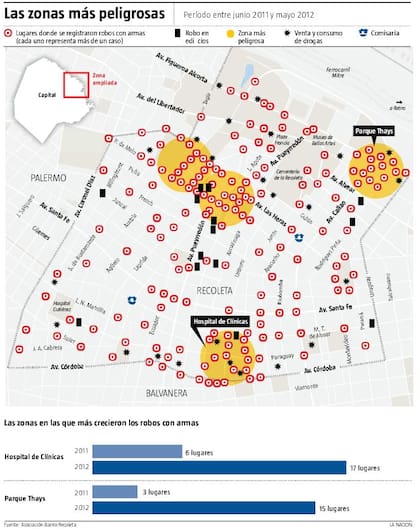 Para mostrar que no es una sensación, a las pruebas concretas de la inseguridad los vecinos de Recoleta las señalaron en un mapa. En él aparecen cuatro "zonas rojas" del delito, que sobresalen por la cantidad de hurtos, asaltos a mano armada y venta de drogas, y en los últimos tiempos se sumaron las llamadas "entraderas" (robos en las puertas de los edificios).