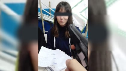 En otra foto, se advierte además cómo uno de los chicos empuña el arma y apunta hacia la cara de una alumna primero, y luego de otro.