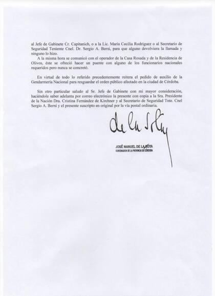 El gobernador de Córdoba, José Manuel De La Sota, le mandó una carta al jefe de Gabinete, Jorge Capitanich, pidiendo colaboración y el envío de la Gendarmería para garantizar la seguridad en la provincia.