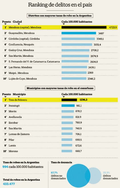 Guaymallén, también en la provincia de Mendoza, aparece en segundo lugar de ese ranking de inseguridad con una tasa de 3487 robos cada cien mil habitantes, mientras que la ciudad de Córdoba tiene una tasa de robos de 3349,1, que la ubica en el tercer lugar.