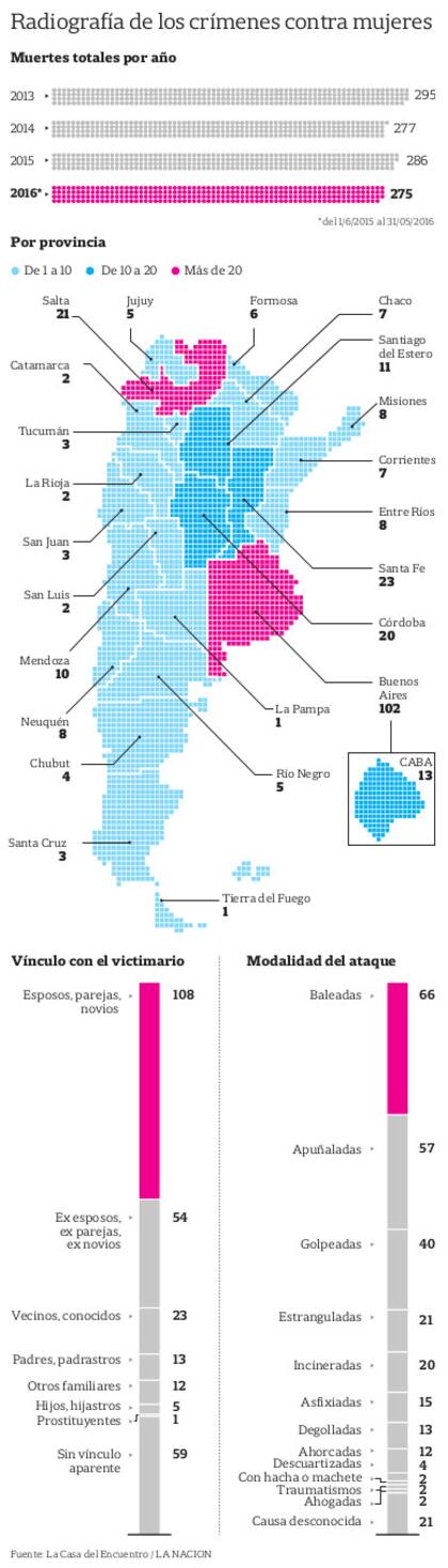 En la víspera de una nueva manifestación, hoy a las 17, en la Capital y en otras 120 ciudades del país, la ONG La Casa del Encuentro, pionera con sus estadísticas, reveló que, entre el 1° de junio del año pasado y el 31 de mayo último hubo 275 femicidios: un promedio de tres mujeres asesinadas cada cuatro días.