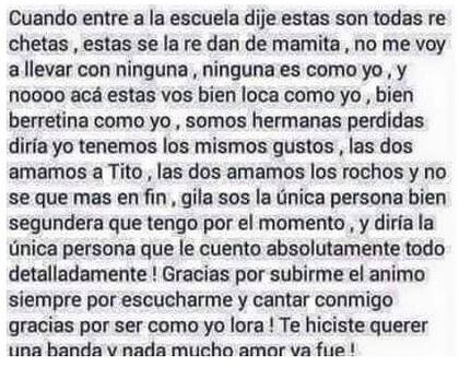 "Cuando entre a la escuela dije estas son todas re chetas, estas se la re dan de mamita, no me voy llevar con ninguna, ninguna es como yo, y noooo acá estás vos bien loca como yo, bien berretina como yo, somos hermanos perdidas diría yo, tenemos los mismos gustos, las dos amamos a Tito, las dos amamos a los rochos y no que mas en fin, gila sos la única persona bien segundera que tengo por el momento y diría la única persona que le cuento absolutamente todo detalladamente! Gracias por subirme el animo siempre por escucharme y gracias por ser como yo lora! Te hiciste querer una banda y nada mucho amor ya fue!"