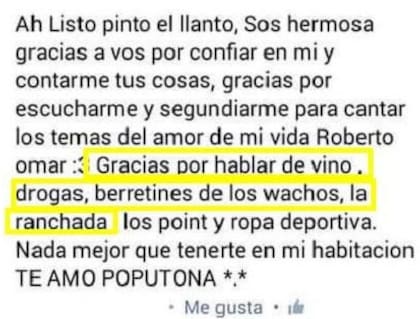 "Ah Listo pinto el llanto, Sos hermosa gracias a vos por confiar en mi y contarme tus cosas, gracias por escucharme y segundiarme para cantar los temas del amor de mi vida Rober omar Gracias por hablar de vino. drogas, berretines de los wacho, la ranchada los point y la ropa deportiva. Nada mejor que tenerte en mi habitación TE AMO POPUTONA."