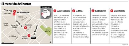 Sin embargo, muy cerca de allí, antes de llegar al puesto de peaje, en la localidad de Villa Madero, partido de La Matanza, hicieron bajar del vehículo a la esposa de Werthein, a la que liberaron sana y salva.