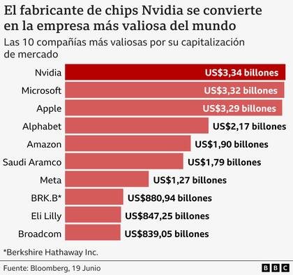Tras un nuevo repunte en el valor de sus acciones, Nvidia alcanzó una valoración bursátil de US$3,34 billones.
