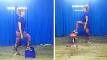 Cómo se hace: de pie frente a un banco o un step, subir al mismo empezando una vez con cada pierna y bajar lentamente de a una pierna por vez.
