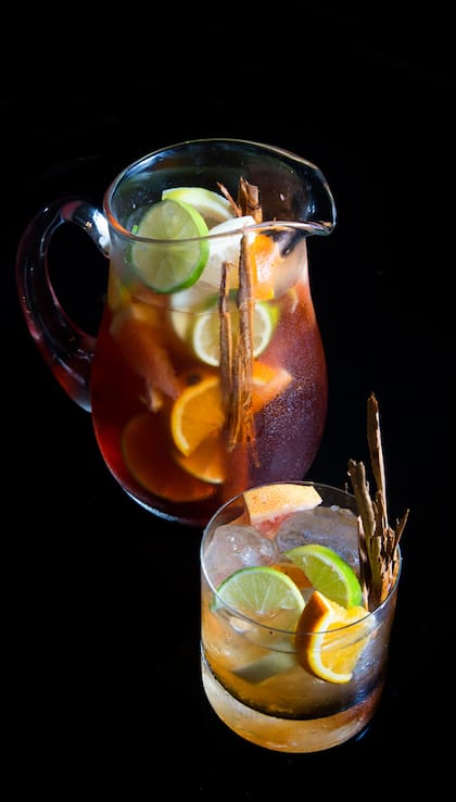 La noche anterior, poné a macerar: 1 taza de jugo de limón, 1 taza de almíbar, las rodajas de 1 limón, 1 lima, 1 naranja, 2 pomelos y rodajitas de jengibre. Agregá 1 taza de bitter rojo, 2 tazas de vermut bianco y 6 clavos de olor o 2 ramitas de canela. Decorá los vasos con gajos de fruta.