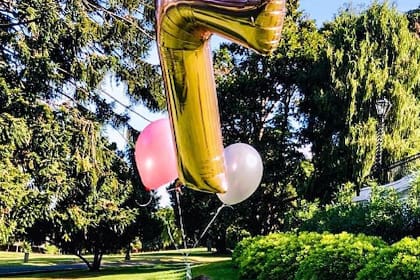 En la foto se puede ver a la pequeña junto a un globo de helio extra grande con la figura del número 7, con un amplio jardín de fondo.
