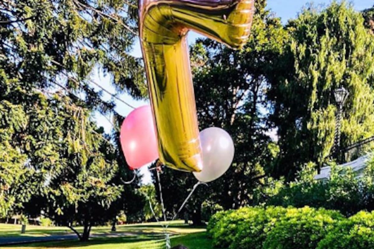 En la foto se puede ver a la pequeña junto a un globo de helio extra grande con la figura del número 7, con un amplio jardín de fondo.