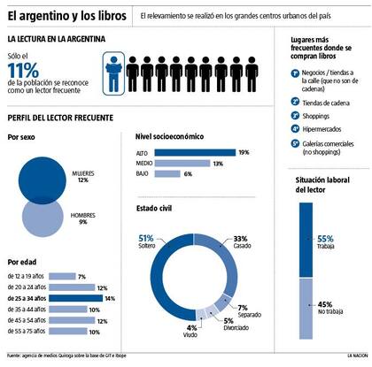 Los pasillos de la Feria del Libro están repletos y en los subterráneos y colectivos porteños es habitual ver gente abstraída en la lectura. Sin embargo, a la hora de optar por un entretenimiento, sólo el 11% de la población urbana del país elige un libro. Entre ellos, los que más leen son mujeres, personas solteras y con trabajo.