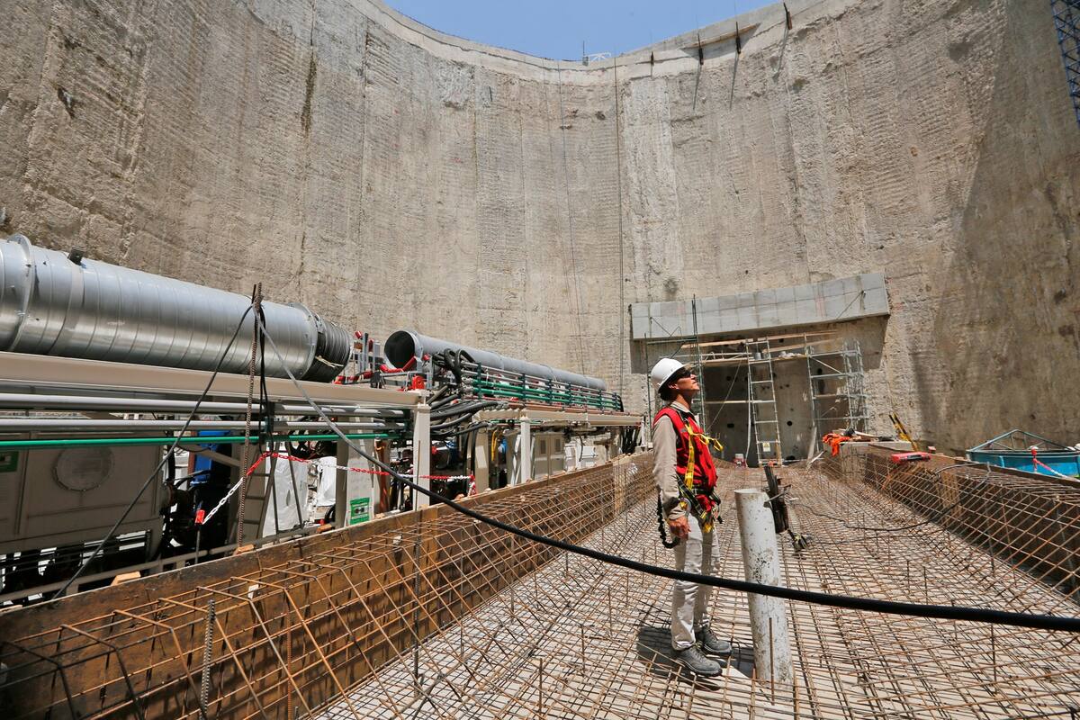 El hoyo tiene 35 metros de diámetro y 25 de profundidad. Primero, se reforzó su contorno interior con paredes de cemento y luego, con excavadoras, se extrajeron 25,000 metros cúbicos de tierra. Cuando el emisario esté habilitado, el túnel trabajará por gravedad y descargará el agua en el pozo, que escurrirá el líquido hacia el río según la presión.